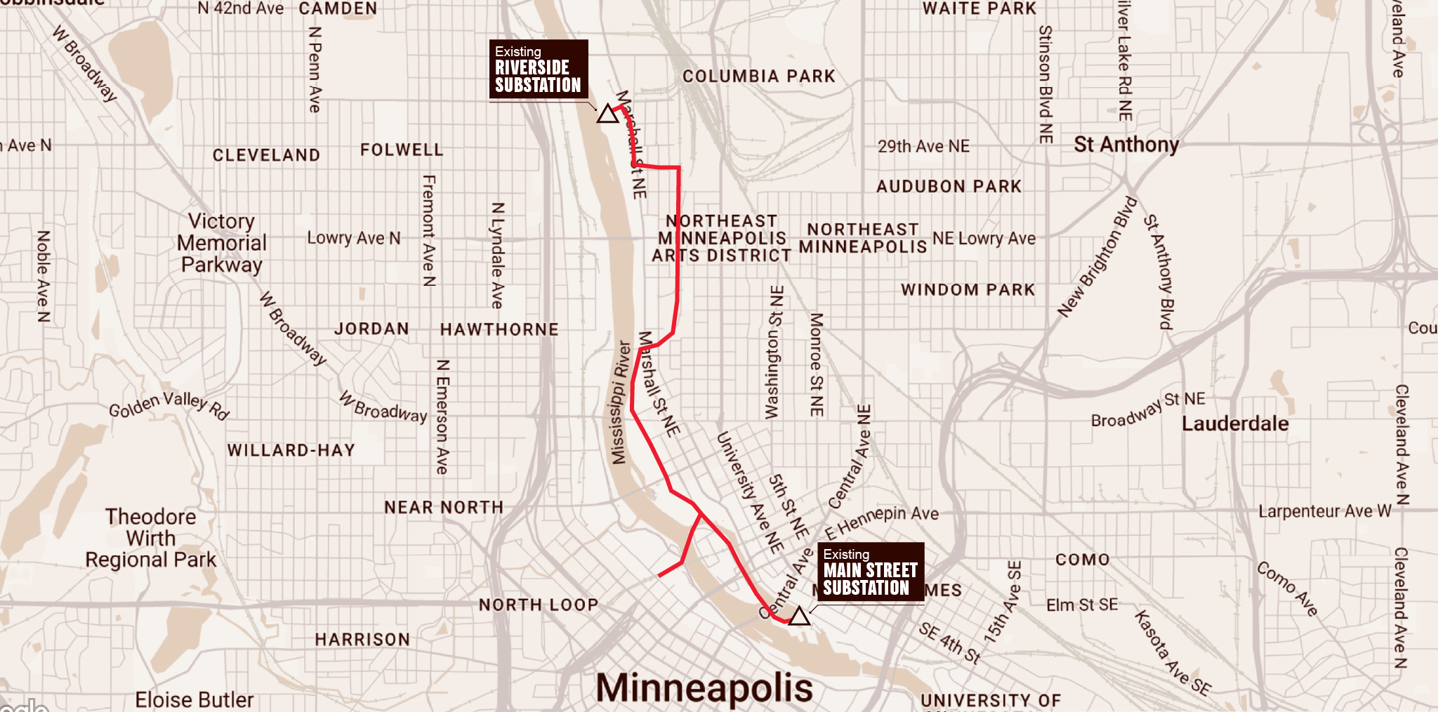 The existing triple-circuit 115-kilovolt (kV) transmission line between the Riverside Plant in Northeast Minneapolis to Main Street substation adjacent to Saint Anthony Falls in Downtown Minneapolis needs repainting and updating. This transmission connection is key to providing reliable electric service to neighborhoods through the core metro, including downtown, St. Anthony Main, and Northeast Minneapolis. The existing poles were installed in 1988, and some poles have peeling paint and discolored surfaces, creating an eyesore for the area. While presenting aesthetic issues, the infrastructure is safe, reliable and necessary to serve communities.