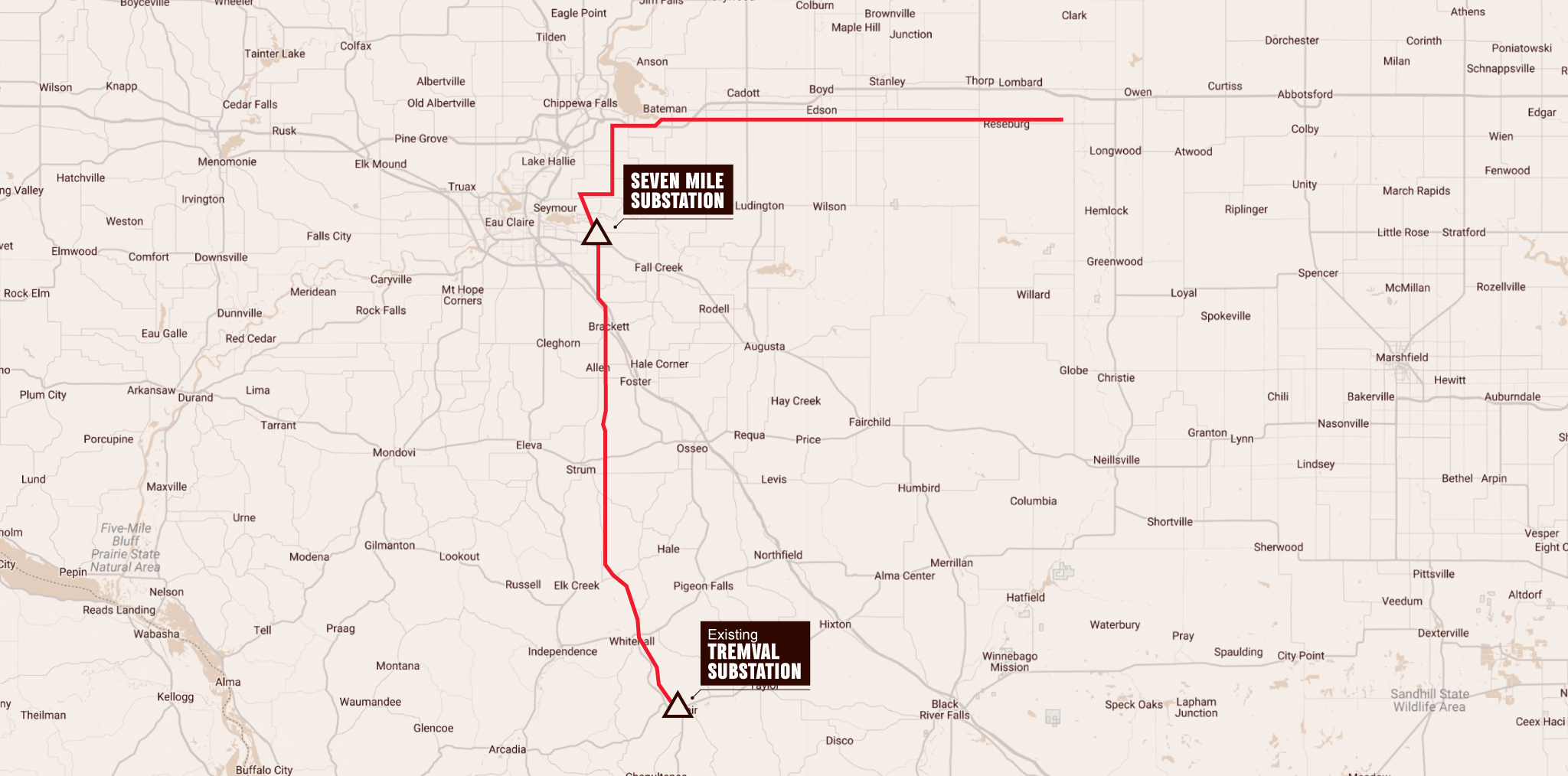 The PSCW approved route (referred in application as Route 2) will travel from the new Larkin Valley Substation (previously referred to as Tremval Substation Expansion), located approximately 0.5miles to the north of the existing Tremval Substation near Blair into Eau Claire County to connect with the new Elk Farm Substation, east and north into Chippewa County generally following State Highway 29, before connecting to the new Jump River Substation (owned by ATC) near Owen in Clark County.