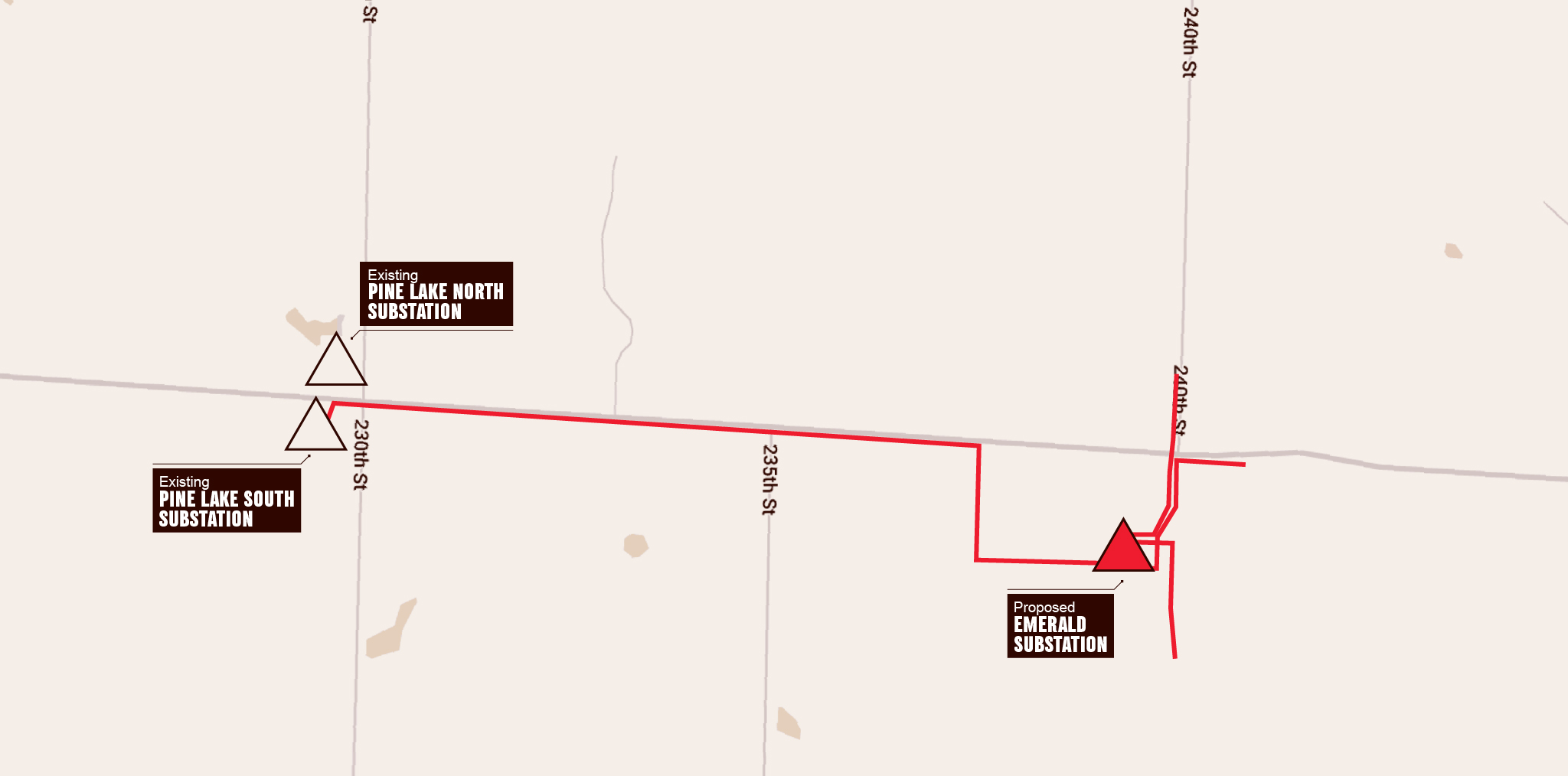 To support anticipated electric growth and ensure continued reliability and safety, Xcel Energy is proposing to construct a new 161/115 kilovolt (kV) substation and associated facilities. The proposal includes rebuilding approximately one mile of existing double circuit transmission line south of County Road DD.  The project allows for the removal of an existing nonstandard 3-way switch and addresses space constraints at the existing Pine Lake North Substation. The single circuit 115 kV transmission line would be rebuilt in the same right-of-way as the existing double circuit 161/115 kV transmission line.