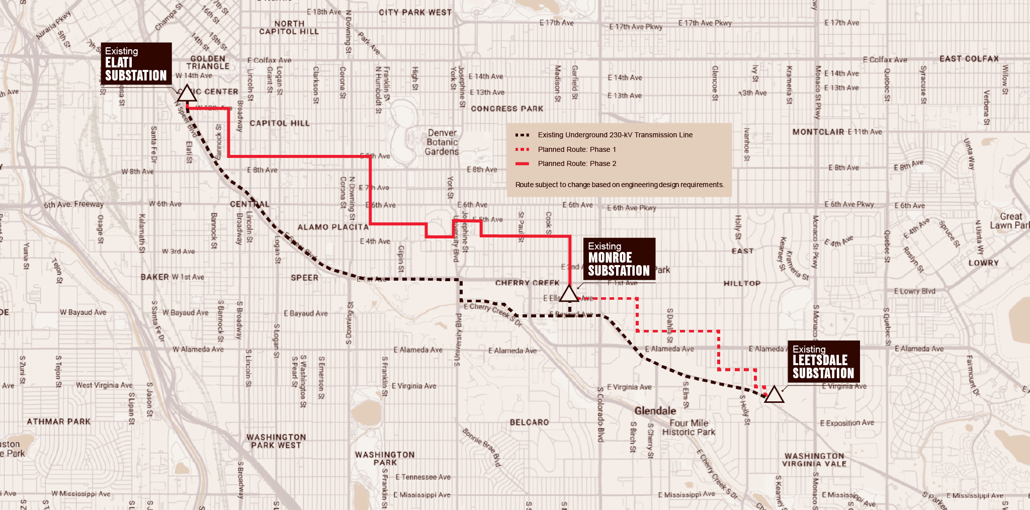 Xcel Energy plans to replace the six-mile-long 230-kilovolt (kV) Leetsdale-Monroe-Elati underground transmission line in central and southeast Denver. This and adjacent areas have experienced tremendous growth in recent years, which has increased the demand for additional, reliable electricity. To address the need, we will install a larger, more modern electric cable system.