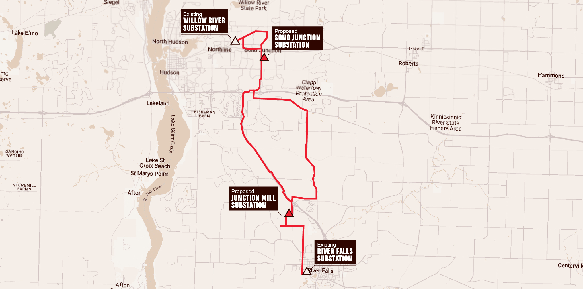 The proposed new transmission line will connect the 115kV line north of River Falls to the 115kV line north of Hudson to provide voltage support for the area, running from the proposed Junction Mill substation (north of River Falls) to the proposed Sono Junction substation, to the existing Willow River substation (northeast of Hudson). Additionally, two substations will be built and five existing ones upgraded to support the transmission line.